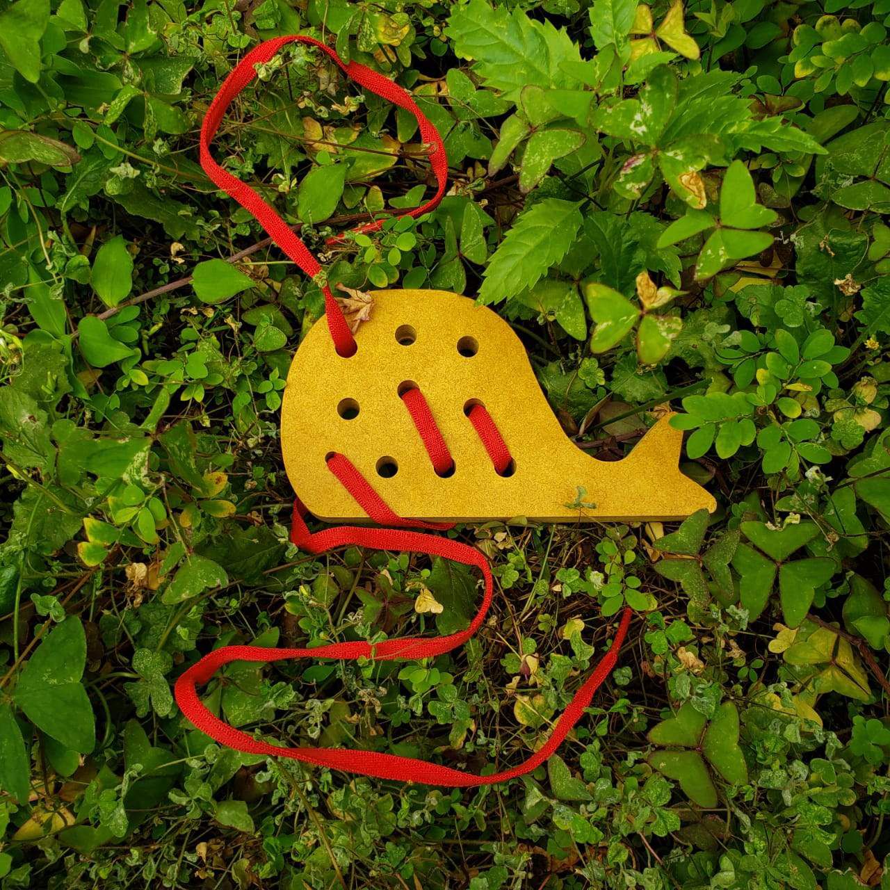 Brinquedo de madeira com costura, em formato de baleia, com inspiração Waldorf e Montessori, que auxilia no desenvolvimento da motricidade fina, capacita a usar os pequenos músculos em movimentos delicados, e também na coordenação visual, solução de problemas e pensamento criativo.